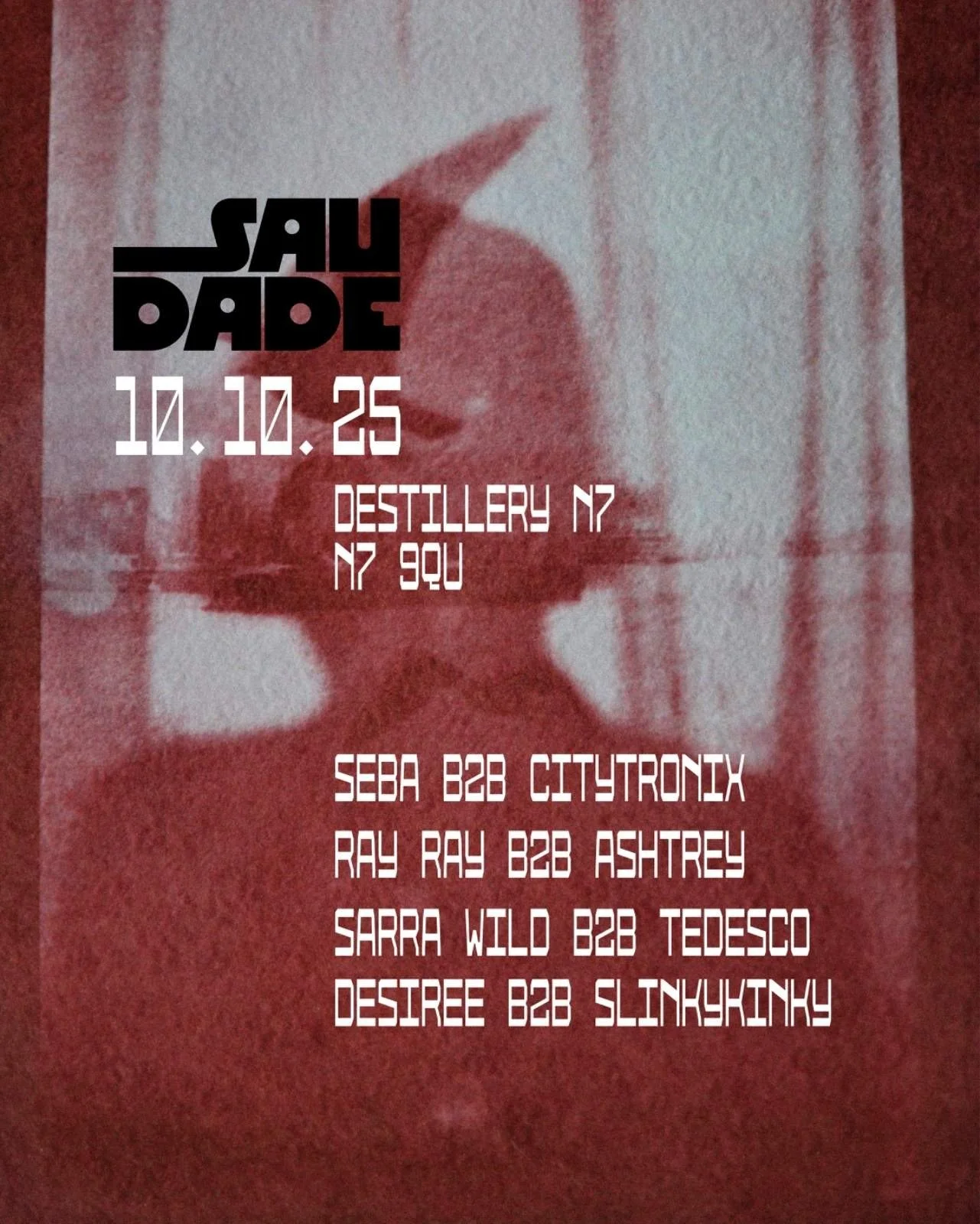 Saudade is all about music, connection, and unapologetic energy. RayRay brings her boundary-pushing sound to Distillery N17 for an all-night celebration of music, connection, and unapologetic energy. The London artist fuses hard groove techno, heavy basslines, and raw hypnotic rhythms with sexy, unfiltered spirit. Joining her is Makaan resident S3BA, a trans*disciplinary musician whose DJ sets span sexy grooves and introspective ambient sounds with political influence, plus Italian-born Desiree' with her deep, mesmerising organic textures, Ashtrey's heavy bass techno, and Slinky Kinky's hypnotic tension and release. In a city oversaturated with noise, Saudade offers clarity - in the words of its founder; “nothing keeps me grounded like creating spaces where people can truly be themselves.”