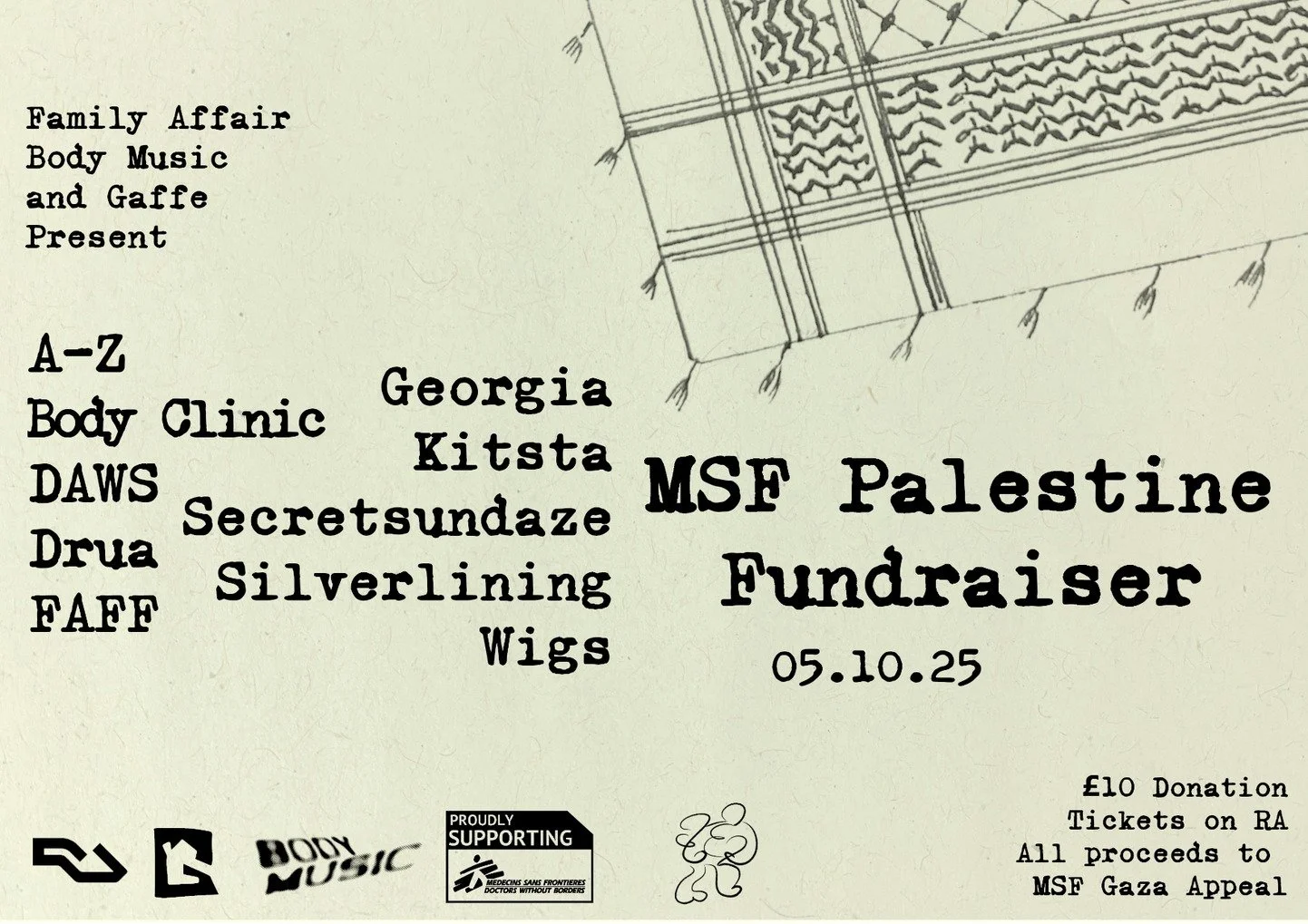 Body Clinic, family affair, and Gaffe present a day-into-night fundraiser in aid of Palestine through Doctors Without Borders Gaza appeal. Silverlining, Secretsundaze, FAFF, Georgia, Daws, Body Clinic, WIGS, Drua and Kitsta join forces for one day only in North London's new warehouse space. 100% of ticket proceeds go to Doctors Without Borders, Gaza Appeal. The dancefloor has always been a space for solidarity and resistance and this event promises to deliver just that. Free Palestine.